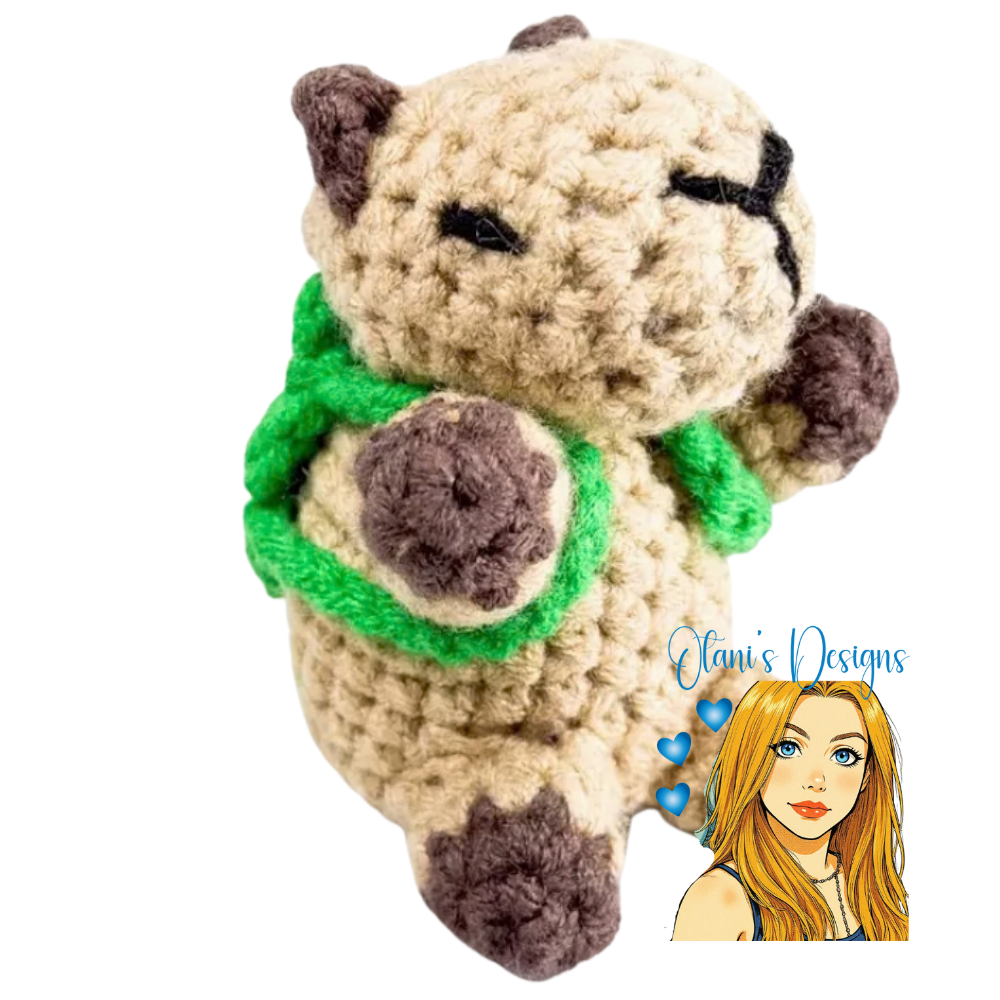 Bring a smile to your day with this adorable Crochet Capybara with green backpack , Handcrafted with love — making it a perfect blend of cuteness and charm. Why you'll love it: Carefully crocheted from 55% cotton and 45% polyacrylic yarn Filled with soft fiber for a cuddly feel Compact and lightweight — Perfect gift for capybara lovers or anyone who adores sweet, whimsical accessories Height: 4 inches)Each capybara is handmade, so slight variations in size and color may occur, making your capybara truly one of a kind! Please note that colors may appear slightly different depending on your screen settings.